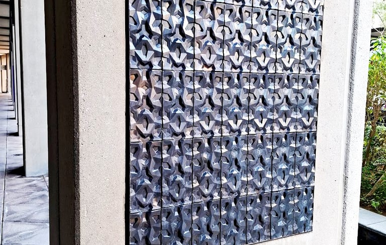 This bespoke installation is sized to fit wall niches originally designed for wayfinding signage on the NYU campus. The porcelain tiles bear a metallic black glaze that reflects light off of the edged surfaces, while the black recesses mimic the surrounding shadows created by the pillared walkway.