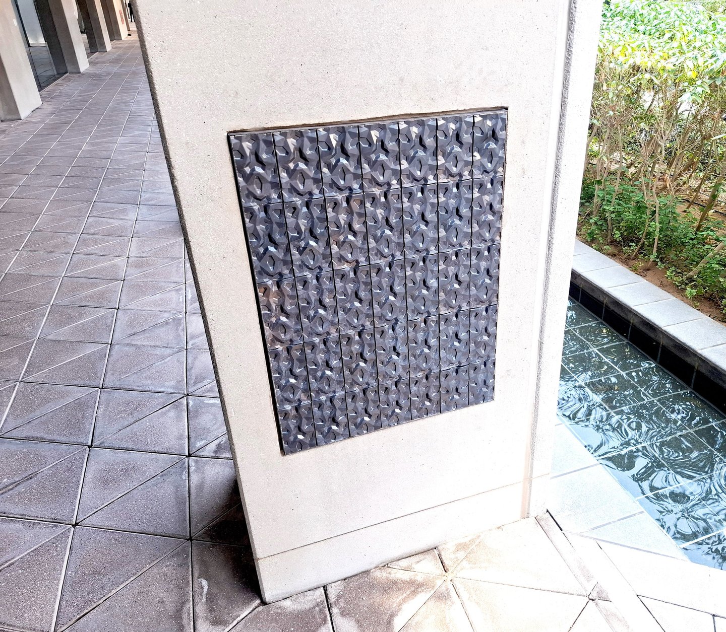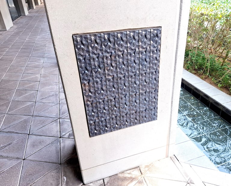 This bespoke installation is sized to fit wall niches originally designed for wayfinding signage on the NYU campus. The porcelain tiles bear a metallic black glaze that reflects light off of the edged surfaces, while the black recesses mimic the surrounding shadows created by the pillared walkway.